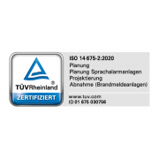 Wir sind für die allgemeine Planung, Planung Sprachalarmanlagen, Projektierung und Abnahme von Brandmeldeanlagen vom TÜV Rheinland nach ISO 14675:2012 zertifiziert worden.